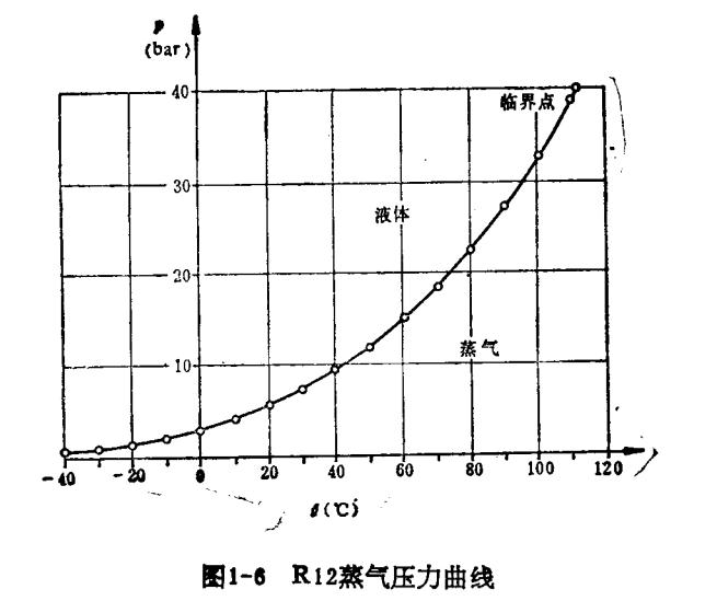 工质的温度只要不超过某一个特征点(临界点),温度即使高一些,蒸气也可液化。如图1-6所示,工质R12在压力约16bar时’