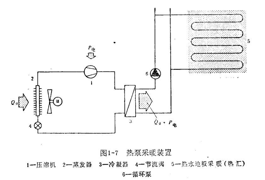 图1-7表示了热泵装置的基本结构。蒸发器工质在温度。和压力po下,由外界空气吸取热流量Q。。压缩机1提高工质蒸气的压力,使它在温度v和压力p下,在冷凝器3中放出热流量Q。。Q。加上驱动功率P所转化成的热流量作为供给热水采暖管网5所需的采暖热流量Q。重新凝结的工质,经节流阀4流回蒸发器,由此重新开始循环。