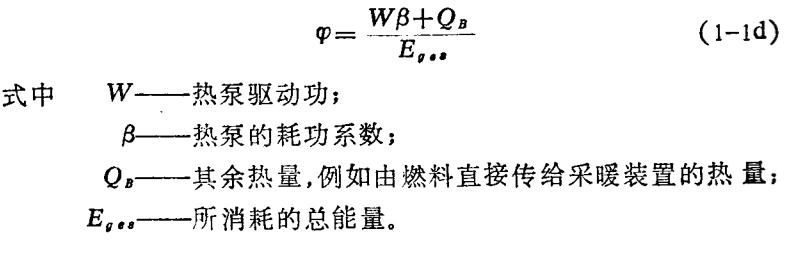 除了热泵经冷凝器给出的有用热量外,还有另外的热量,例如直接燃烧取得的热量或者内燃机所损失的热量,这两部分热量也都传给低温热源。这两部分热量之和与所消耗的总能量之比,称为采暖系数P: