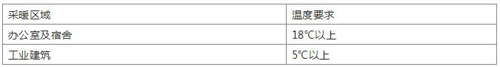 由于项目建筑类型和使用用途不同,对温度的需求也不一样。例如,办公室及员工宿舍对温度要求就要满足18℃以上,而厂区没人工作时只需要维持不被冻即可,在5℃以上即可。具体见下表: